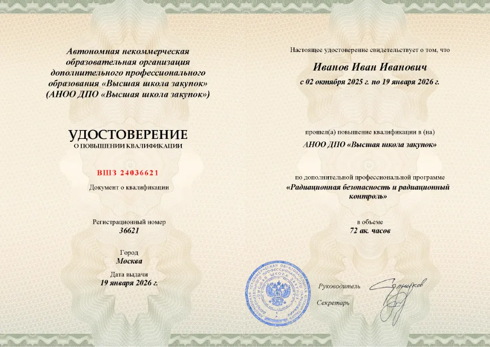 Повышение квалификации, 72 академических часа, 9 модулей: законодательное и нормативное обеспечение, дозиметрия и приборная база, лицензирование, методики радиационной защиты при эксплуатации и обслуживании установок, действия при авариях и ЧС. Онлайн-обучение в в Кемерове с итоговой аттестацией.